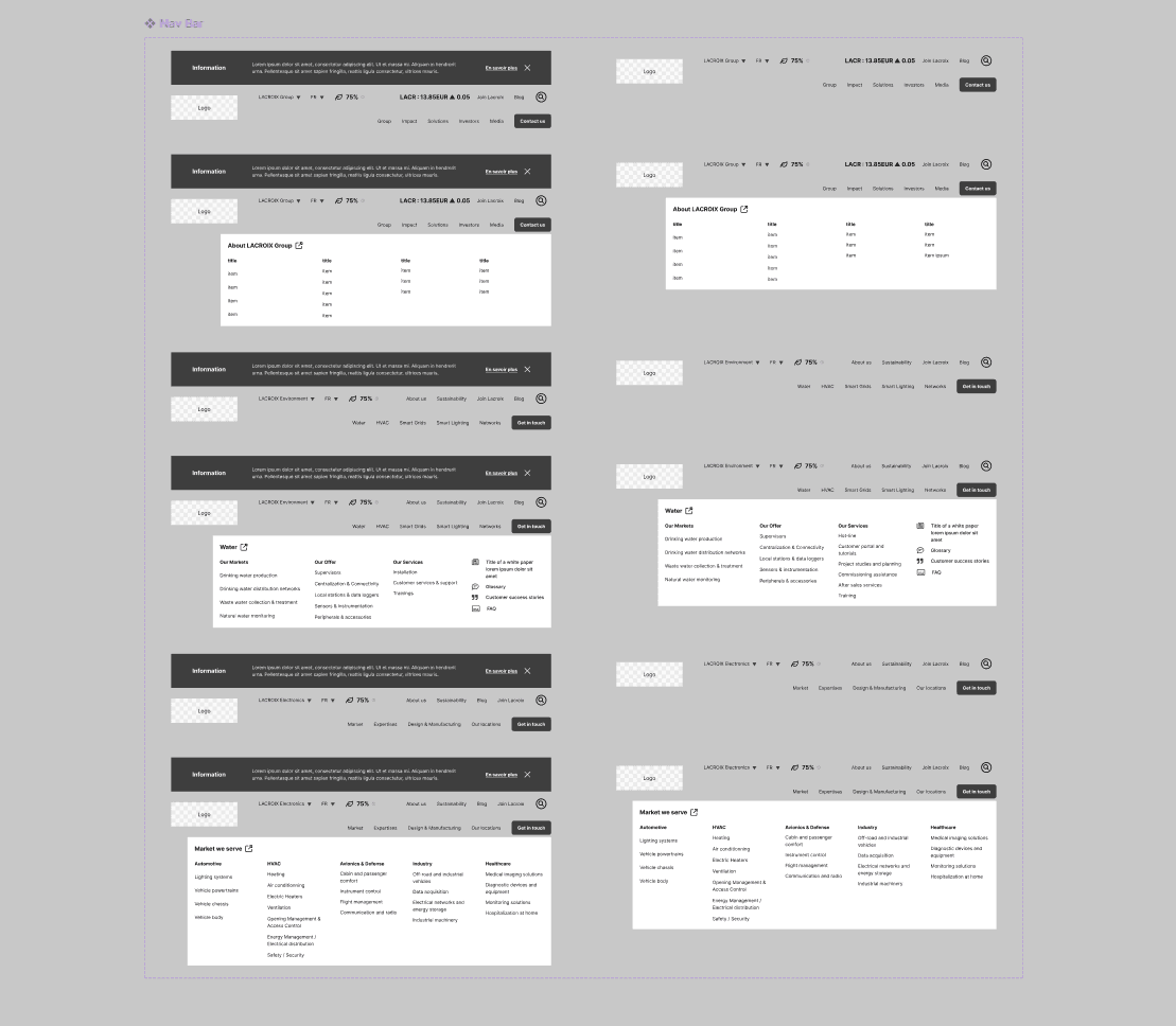 La démarche UX s’est appuyée sur une analyse de l’existant et un benchmark de concurrents directs ainsi que de groupes cotés disposant d’écosystèmes digitaux complexes. Ces analyses ont permis d’identifier les bonnes pratiques de structuration de l’information, de terminologie et de présentation d’offres techniques.