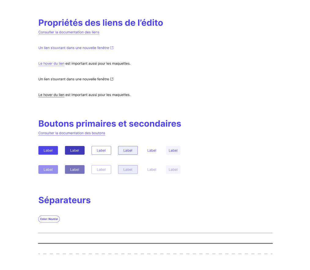 En parallèle, un audit des composants déjà développés, des gabarits WordPress, ainsi que des contraintes liées à l’accessibilité et au référencement a mis en évidence la nécessité de créer un miroir cohérent entre un kit de composants techniques et son équivalent graphique et documentaire sur Figma.