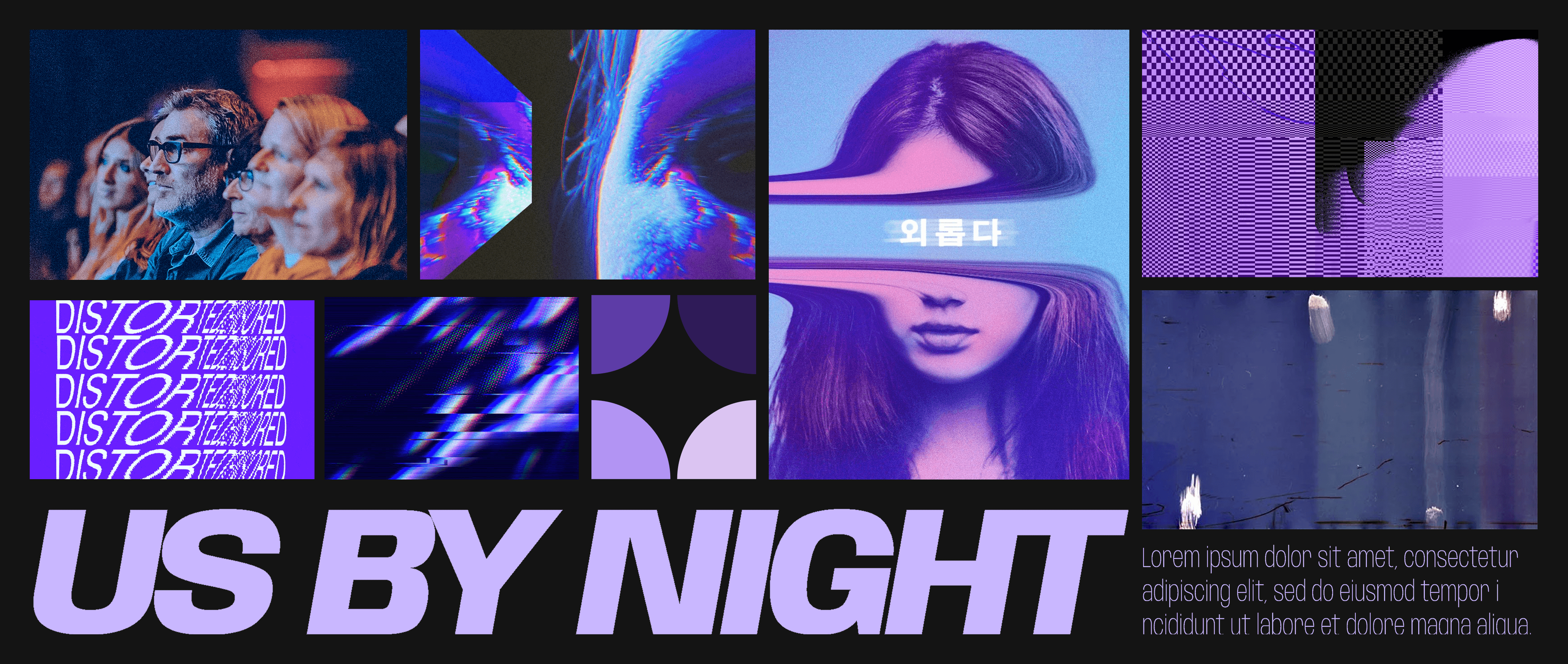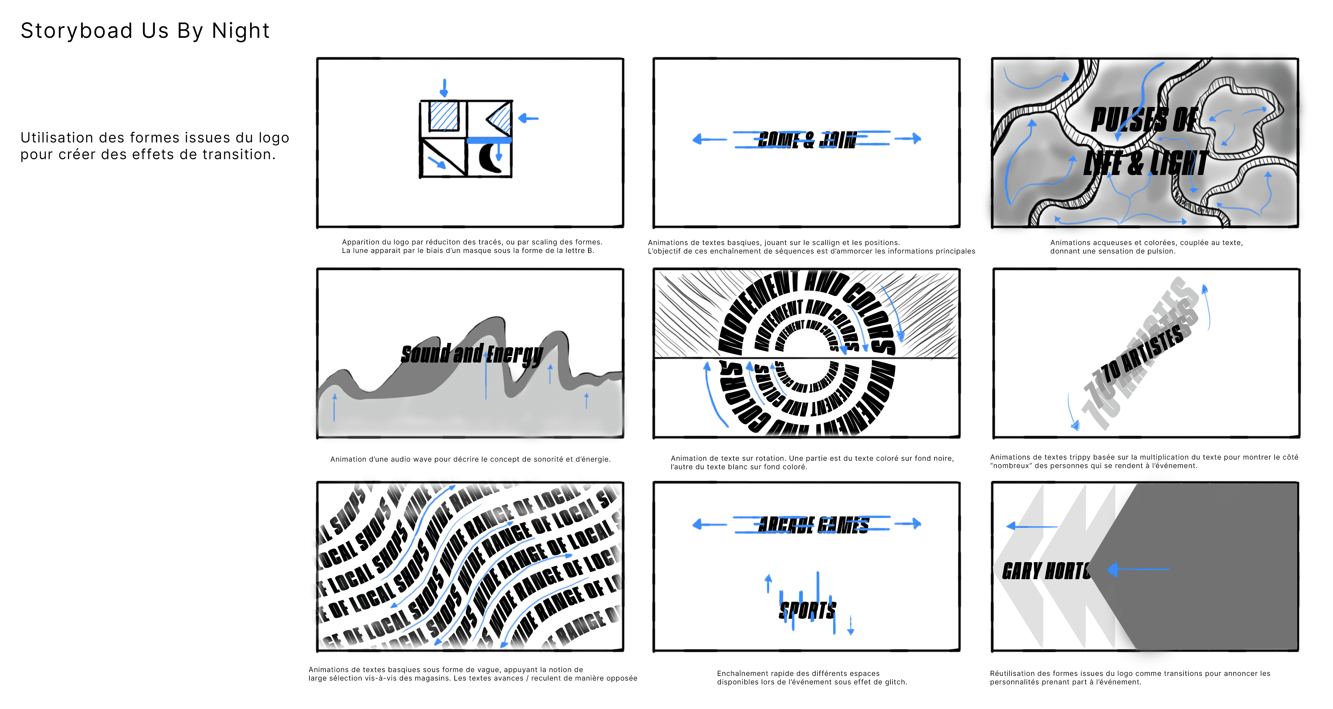 La phase de production a débuté par un benchmark des identités graphiques précédentes du festival Us by Night, afin d’en comprendre les codes et d’identifier des axes de différenciation. Cette analyse a volontairement conduit à un positionnement graphique radicalement distinct des éditions antérieures.